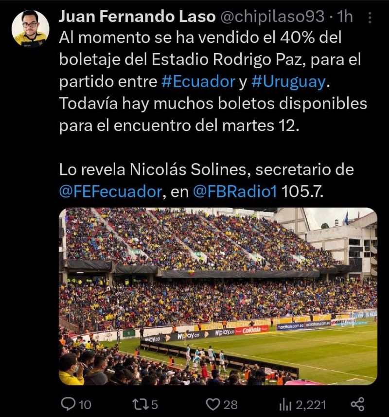 Hace pocos días atrás, se dio a conocer como se realizarían las ventas de boletos para los partidos de la Tri, por parte de la FEF para el partido contra Uruguay. Pero al parecer muchos hinchas no han podido adquirir sus boletos, ya que en una entrevista con FB Radio, según el secretario de la FEF, Nicolás Solines, “Al momento se ha vendido el 40% del boletaje del Estadio Rodrigo Paz, para ver el partido entre Ecuador y Uruguay. Todavía hay muchos boletos disponibles para el encuentro del martes 12.”