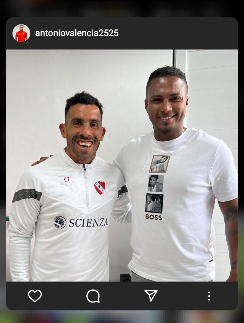 Tras la derrota de Ecuador, Antonio Valencia habría la oportunidad de estar en territorio argentino para visitar a uno de los jugadores que también jugó en el Manchester, Carlos Tevez. Esto según lo dio a entender Valencia en su red social de Instagram. En donde subió una foto con el ex futbolista y escribió “Hoy tuve la oportunidad de visitar y hablar de fútbol con un grande. La pasión es grande. Gracias Carlitos por tu humildad y espero que todo te vaya bien en la vida. Un abrazo grande”.