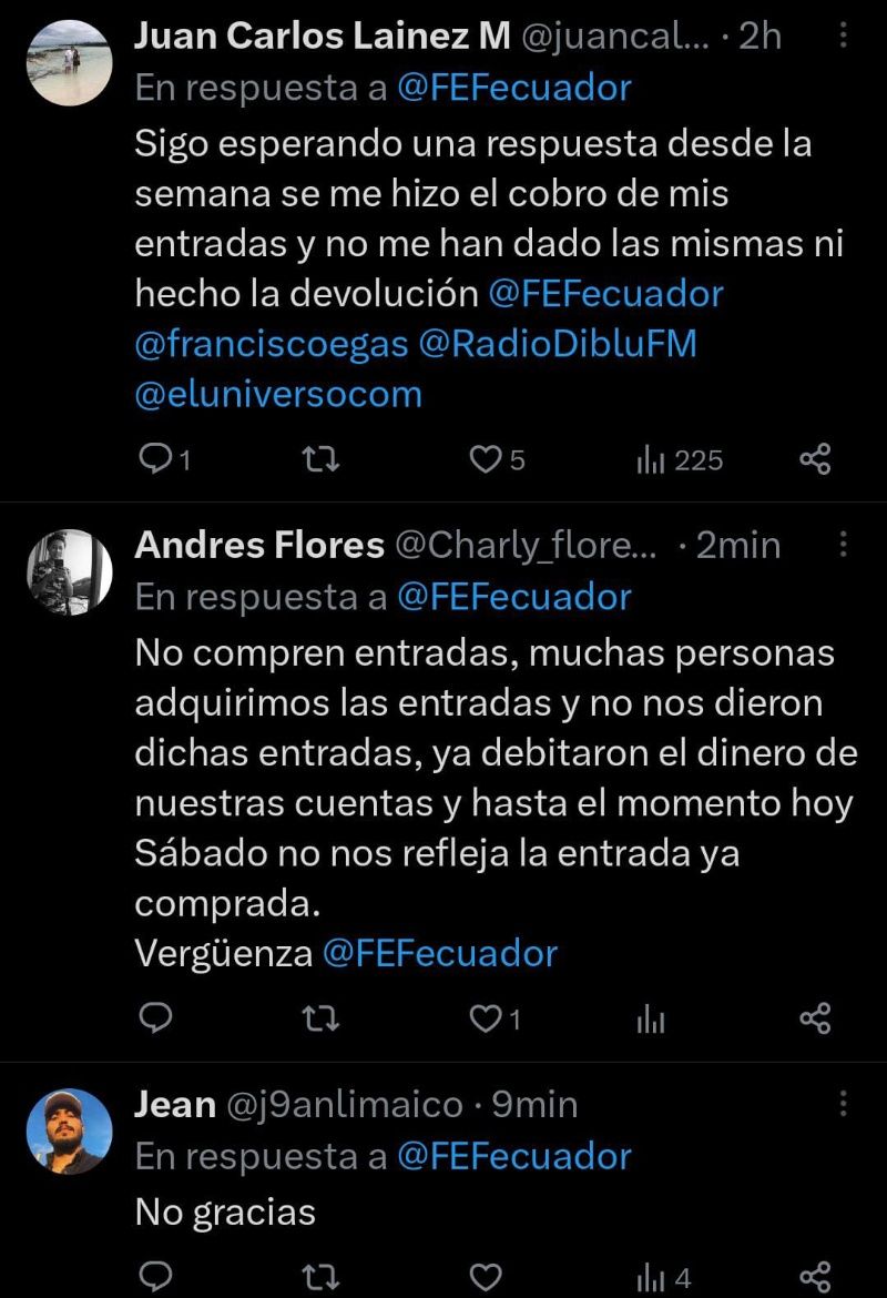 O comentarios como “No compren entradas, muchas personas adquirimos las entradas y no nos dieron dichas entradas, ya debitaron el dinero de nuestras cuentas.”. Dando a conocer su enojo sobre la mala atención que han recibido las entradas para ver el partido entre Ecuador y Uruguay en el Estadio Rodrigo Paz.