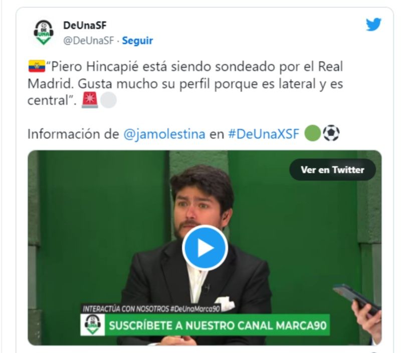 En el programa De Una, el periodista Alberto Molestina reveló que “Al Real Madrid le interesa Piero Hincapié, esta información me la dieron en Brasil hace un mes y pico. Lo han visto muy bien, pero que gusta mucho su perfil porque es lateral y central”. Una gran noticia para el país que uno de los equipos más importantes del mundo se interese en el defensa surgido en Independiente del Valle.