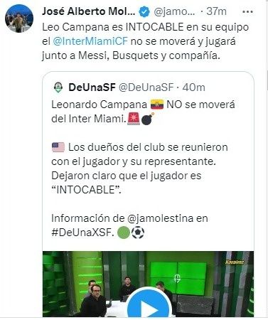Con Leonardo Campana parece que la historia terminaría de diferente manera. Comenzaron las advertencias de una posible salida del tricolor con la llegada del astro argentino. Sin embargo, eso no se daría. El periodista Alberto Molestina, en el programa De Una, aseguró que “Leo Campana es INTOCABLE en su equipo el no se moverá y jugará junto a Messi”.