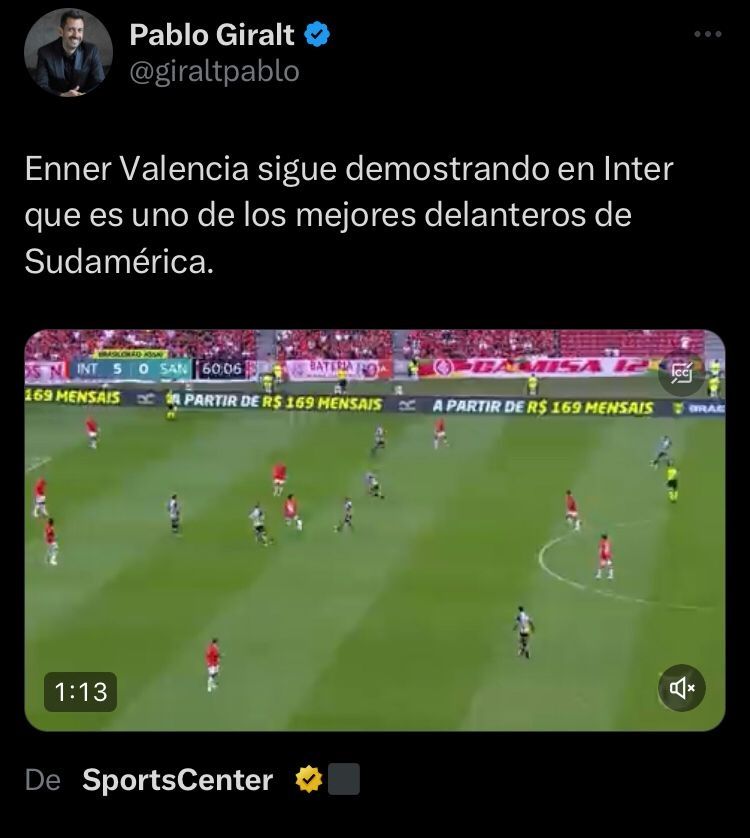 El delantero ecuatoriano hoy fue clave en la histórica goleada a Santos de 7-1, el jugador pudo marcar un doblete siendo aplaudido cuando lo reemplazaron por los hinchas del Inter de Brasil. El periodista argentino Pablo Giralt publicó en su cuanta de Twitter : “Enner Valencia sigue demostrando en Inter que es uno de los mejores delanteros de Sudamérica.”
