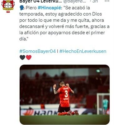 Hace pocas horas, el Bayer Leverkusen posteó lo que dijo de Piero Hincapié tras el fin del torneo local. “Se acabó la temporada, estoy agradecido con Dios (…) ahora descansaré y volveré más fuerte, gracias a la afición por apoyarnos desde el primer día”, fueron las expresiones que publicó el conjunto de las aspirinas.