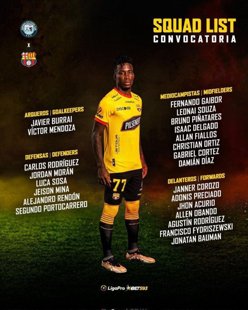 El técnico interino de Barcelona SC dio a conocer la lista de convocados para enfrentar a los pupilos de Pool Gavilánez. Entre los integrantes, se registra el retorno de Paco Rodríguez y la inclusión del delantero Allen Obando, quien supo ser figura con la Selección Ecuatoriana en el Sudamericano Sub-17 organizado en el país.