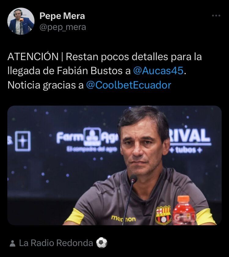 Ahora Bustos tiene todo arreglado para llegar en las próximas horas a un viejo conocido, Aucas que recientemente despidió a César Farías tendría todo listo para contratar a Fabián Bustos, así lo reveló el colega Pepe Mera. Este sería un golpe bajo para el barcelonismo debido a que Aucas fue quien le quitó el título a Barcelona SC.